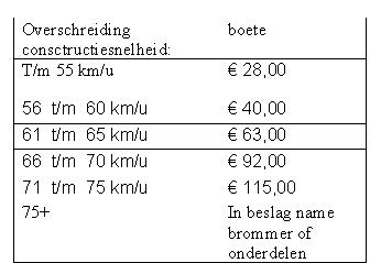 Nu zul je mischien denken, sh*t mijn scooter die loopt op mijn teller al gauw tegen de 80 en hij is alleen maar onbegrensd. Maar de juten zouden de juten niet zijn als ze zo stom waren. Want een rollerbank wijkt net zo veel af als de Aprilia-teller (ongeveer 20 km) alleen dan naar beneden. Dus dan zou je op de rollerbank maar 60 gaan en heb je maar een boete van 40,00 Euro. En ik kan het weten, waarom dat kun je lezen in "mijn ervaring met de politie". Snelle rekenmensen weten nu dus ook hoe hard je je brommer kan opvoeren zonder dat deze in beslag wordt genomen, ja inderdaad dat is pas tegen de 100km/u aan. En daarvoormoet je toch wel het een en het ander sleutelen voordat je die snelheid haalt. En als je dan die snelheid haalt en je wordt gepakt dan ben je echt flink de pineut. Je hele scooter zal in beslag worden genomen voor nader onderzoek, je bent je scooter dan zeker voor 2 weken kwijt. Na die 2 weken kun je hem waarschijnlijk weer ophalen, maar dan hebben ze wel alles wat niet origineel aan je scooter was eraf gesleuteld, bij een vriend van mij hadden ze zelfs zijn originele carburateur eraf gesloopt, maar nadat hij hiertegen een protest had ingediend kreeg hij deze weer terug.